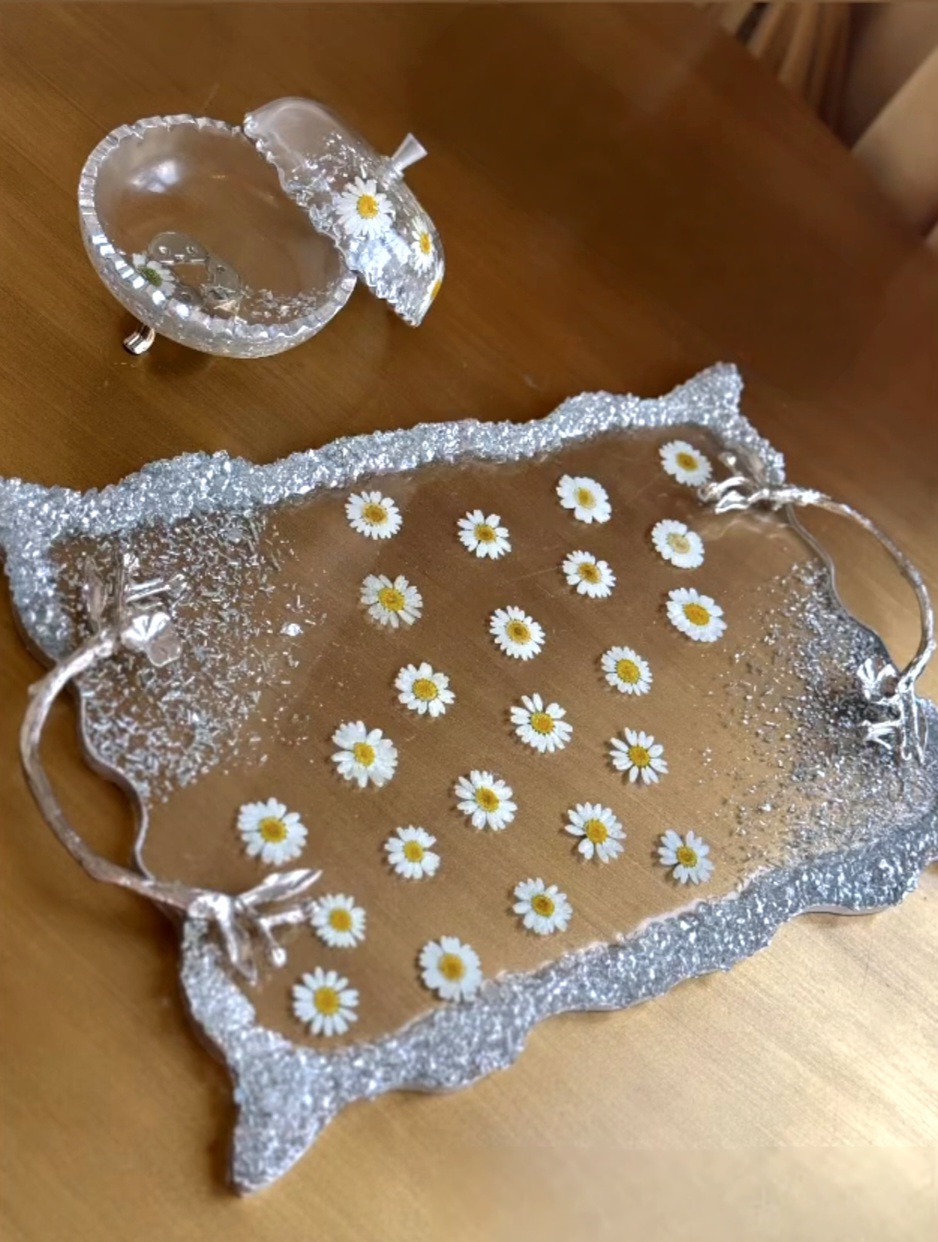 متاسفانه این کالا در حال حاضر موجود نیست. میتوانید از طریق لیست بالای صفحه، از محصولات مشابه این کالا دیدن نمایید.سینی مستطیل رزینی ۴۰ سانت بسیار شیک کار شده با ورق طلا و گل بابونه طبیعی که خاصترش کرده و دسته های رنگ ثابت شست و شو آسان فقط با دستمال نم دار یا با ابر شسته شه☝️اجسام تیز روی سطح کار نکشید بعد از اینکه محصول دست شما رسید بعد از 2 هفته میتونید استفاده کنید
