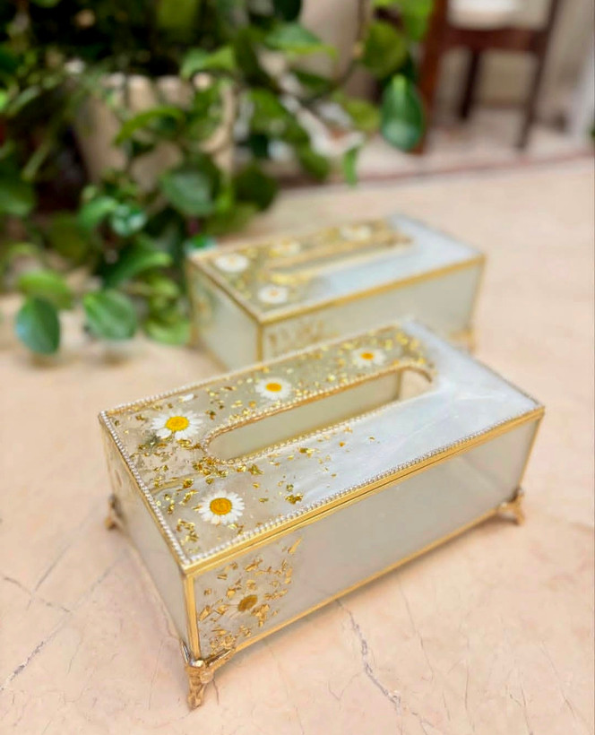 جا دستمال کاغذی شیشه ای نوار دور برنج آبکاری شده رنگ ثابت، کار شده با ورق طلا و گل بابونه در رنگهای طلایی و نقره ای میتونید ثبت سفارش کنید 🙏
